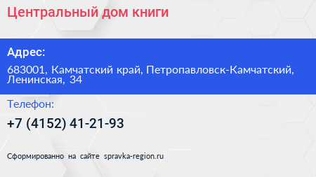 Центральный, дом книги по адресу 683001, Камчатский край, Петропавловск-Камчатский, Ленинская, 34 в дальнейшем Организация, размещена в следующих категориях: