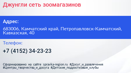 Джунгли, сеть зоомагазинов по адресу 683006, Камчатский край, Петропавловск-Камчатский, Кавказская, 40 в дальнейшем Организация, размещена в следующих категориях: