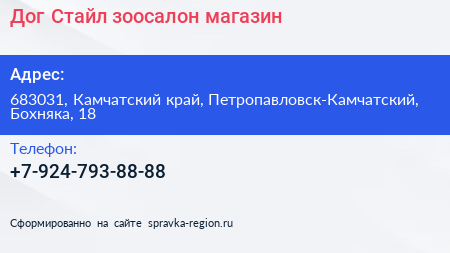 Дог Стайл, зоосалон-магазин по адресу 683031, Камчатский край, Петропавловск-Камчатский, Бохняка, 18 в дальнейшем Организация, размещена в следующих категориях: