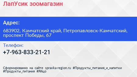 ЛапУсик, зоомагазин по адресу 683902, Камчатский край, Петропавловск-Камчатский, проспект Победы, 67 в дальнейшем Организация, размещена в следующих категориях:
