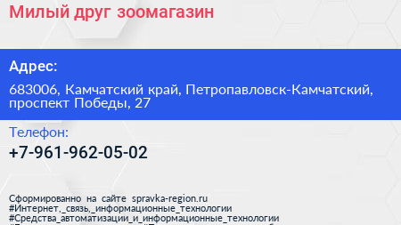 Милый друг, зоомагазин по адресу 683006, Камчатский край, Петропавловск-Камчатский, проспект Победы, 27 в дальнейшем Организация, размещена в следующих категориях: