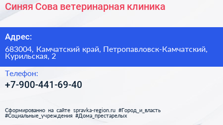 Синяя Сова, ветеринарная клиника по адресу 683004, Камчатский край, Петропавловск-Камчатский, Курильская, 2 в дальнейшем Организация, размещена в следующих категориях: