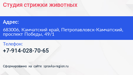 Студия стрижки животных по адресу 683006, Камчатский край, Петропавловск-Камчатский, проспект Победы, 49/1 в дальнейшем Организация, размещена в следующих категориях: