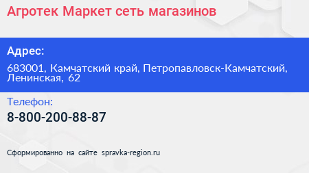Агротек Маркет, сеть магазинов по адресу 683001, Камчатский край, Петропавловск-Камчатский, Ленинская, 62 в дальнейшем Организация, размещена в следующих категориях: