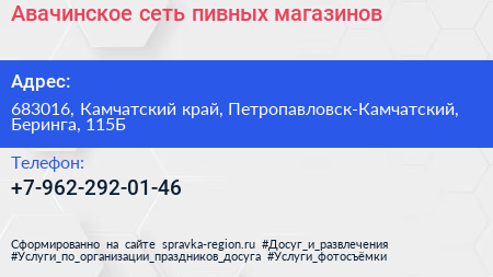 Авачинское, сеть пивных магазинов по адресу 683016, Камчатский край, Петропавловск-Камчатский, Беринга, 115Б в дальнейшем Организация, размещена в следующих категориях: