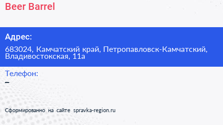 Beer Barrel по адресу 683024, Камчатский край, Петропавловск-Камчатский, Владивостокская, 11а в дальнейшем Организация, размещена в следующих категориях: