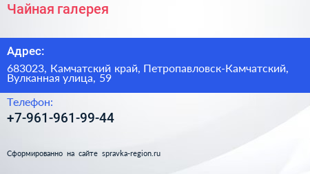 Чайная галерея по адресу 683023, Камчатский край, Петропавловск-Камчатский, Вулканная улица, 59 в дальнейшем Организация, размещена в следующих категориях: