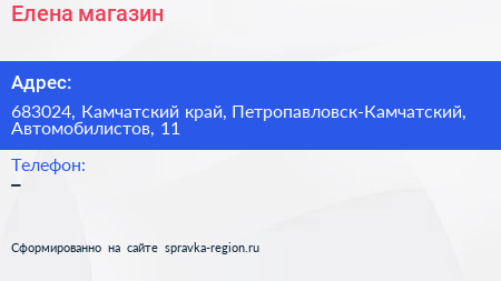 Елена, магазин по адресу 683024, Камчатский край, Петропавловск-Камчатский, Автомобилистов, 11 в дальнейшем Организация, размещена в следующих категориях: