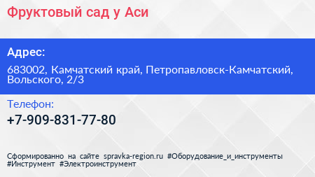 Фруктовый сад у Аси по адресу 683002, Камчатский край, Петропавловск-Камчатский, Вольского, 2/3 в дальнейшем Организация, размещена в следующих категориях: