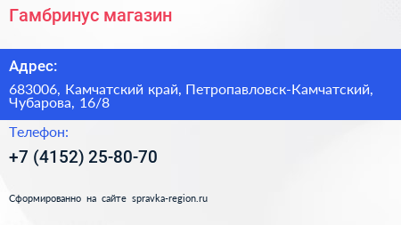 Гамбринус, магазин по адресу 683006, Камчатский край, Петропавловск-Камчатский, Чубарова, 16/8 в дальнейшем Организация, размещена в следующих категориях: