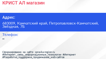 КРИСТ-АЛ, магазин по адресу 683009, Камчатский край, Петропавловск-Камчатский, Звёздная, 7Б в дальнейшем Организация, размещена в следующих категориях: