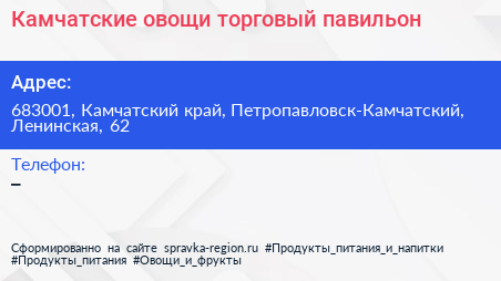 Камчатские овощи, торговый павильон по адресу 683001, Камчатский край, Петропавловск-Камчатский, Ленинская, 62 в дальнейшем Организация, размещена в следующих категориях: