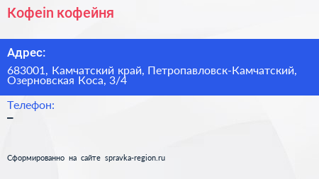 Кофеin, кофейня по адресу 683001, Камчатский край, Петропавловск-Камчатский, Озерновская Коса, 3/4 в дальнейшем Организация, размещена в следующих категориях: