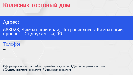 Колесник, торговый дом по адресу 683023, Камчатский край, Петропавловск-Камчатский, проспект Содружества, 10 в дальнейшем Организация, размещена в следующих категориях: