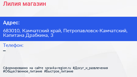 Лилия, магазин по адресу 683010, Камчатский край, Петропавловск-Камчатский, Капитана Драбкина, 3 в дальнейшем Организация, размещена в следующих категориях: