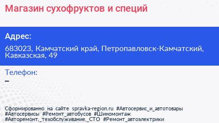 Магазин сухофруктов и специй по адресу 683023, Камчатский край, Петропавловск-Камчатский, Кавказская, 49 в дальнейшем Организация, размещена в следующих категориях: