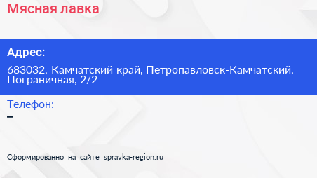 Мясная лавка по адресу 683032, Камчатский край, Петропавловск-Камчатский, Пограничная, 2/2 в дальнейшем Организация, размещена в следующих категориях: