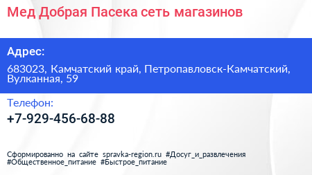 Мед Добрая Пасека, сеть магазинов по адресу 683023, Камчатский край, Петропавловск-Камчатский, Вулканная, 59 в дальнейшем Организация, размещена в следующих категориях: