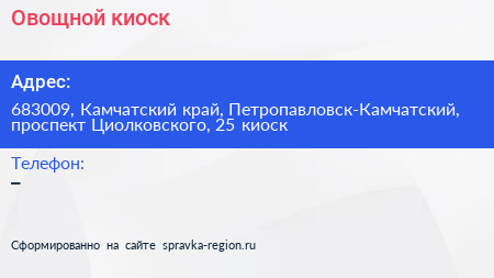 Овощной киоск по адресу 683009, Камчатский край, Петропавловск-Камчатский, проспект Циолковского, 25 киоск в дальнейшем Организация, размещена в следующих категориях: