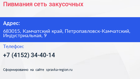 Пивмания, сеть закусочных по адресу 683015, Камчатский край, Петропавловск-Камчатский, Индустриальная, 9 в дальнейшем Организация, размещена в следующих категориях: