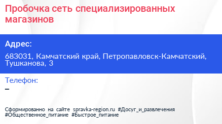 Пробочка, сеть специализированных магазинов по адресу 683031, Камчатский край, Петропавловск-Камчатский, Тушканова, 3 в дальнейшем Организация, размещена в следующих категориях: