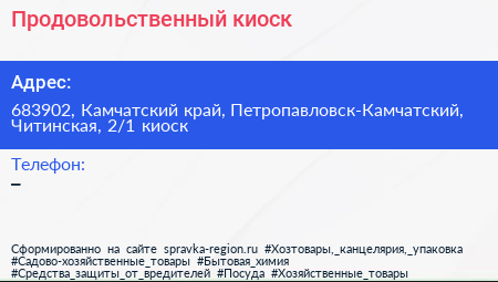 Продовольственный киоск по адресу 683902, Камчатский край, Петропавловск-Камчатский, Читинская, 2/1 киоск в дальнейшем Организация, размещена в следующих категориях: