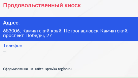 Продовольственный киоск по адресу 683006, Камчатский край, Петропавловск-Камчатский, проспект Победы, 27 в дальнейшем Организация, размещена в следующих категориях: