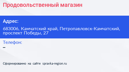 Продовольственный магазин по адресу 683006, Камчатский край, Петропавловск-Камчатский, проспект Победы, 27 в дальнейшем Организация, размещена в следующих категориях: