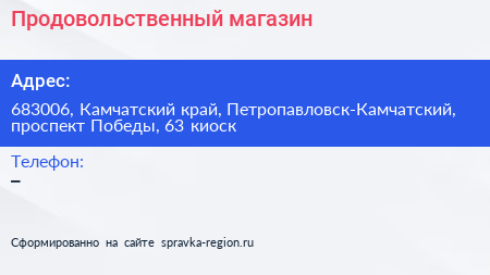 Продовольственный магазин по адресу 683006, Камчатский край, Петропавловск-Камчатский, проспект Победы, 63 киоск в дальнейшем Организация, размещена в следующих категориях: