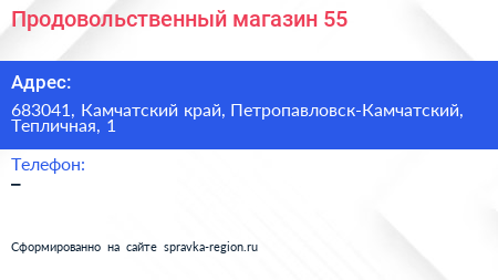 Продовольственный магазин №55 по адресу 683041, Камчатский край, Петропавловск-Камчатский, Тепличная, 1 в дальнейшем Организация, размещена в следующих категориях: