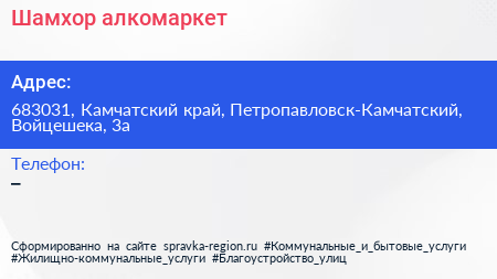 Шамхор, алкомаркет по адресу 683031, Камчатский край, Петропавловск-Камчатский, Войцешека, 3а в дальнейшем Организация, размещена в следующих категориях: