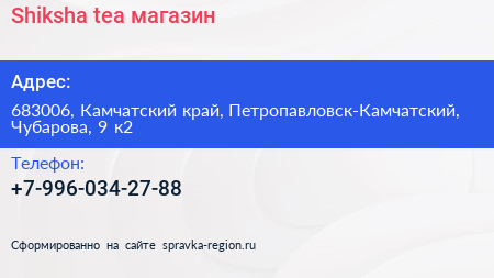Shiksha tea, магазин по адресу 683006, Камчатский край, Петропавловск-Камчатский, Чубарова, 9 к2 в дальнейшем Организация, размещена в следующих категориях: