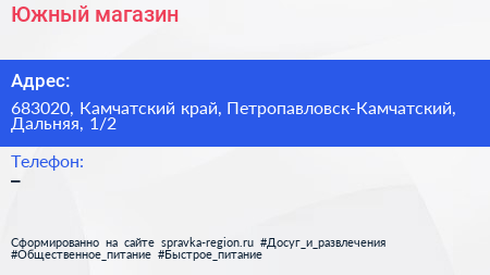 Южный, магазин по адресу 683020, Камчатский край, Петропавловск-Камчатский, Дальняя, 1/2 в дальнейшем Организация, размещена в следующих категориях:
