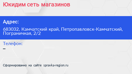 Юкидим, сеть магазинов по адресу 683032, Камчатский край, Петропавловск-Камчатский, Пограничная, 2/2 в дальнейшем Организация, размещена в следующих категориях: