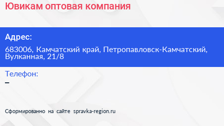 Ювикам, оптовая компания по адресу 683006, Камчатский край, Петропавловск-Камчатский, Вулканная, 21/8 в дальнейшем Организация, размещена в следующих категориях: