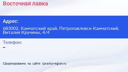 Восточная лавка по адресу 683002, Камчатский край, Петропавловск-Камчатский, Виталия Кручины, 4/4 в дальнейшем Организация, размещена в следующих категориях: