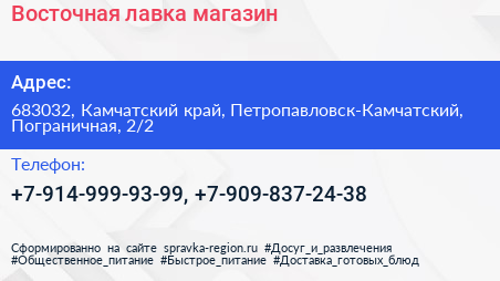 Восточная лавка, магазин по адресу 683032, Камчатский край, Петропавловск-Камчатский, Пограничная, 2/2 в дальнейшем Организация, размещена в следующих категориях:
