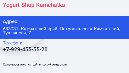 Yogurt Shop Kamchatka по адресу 683031, Камчатский край, Петропавловск-Камчатский, Тушканова, 7 в дальнейшем Организация, размещена в следующих категориях: