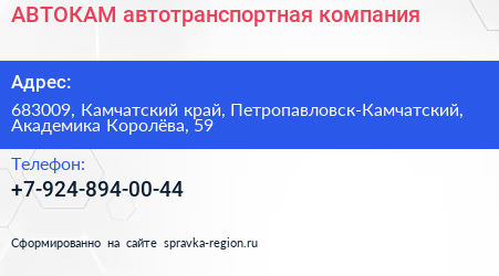 АВТОКАМ, автотранспортная компания по адресу 683009, Камчатский край, Петропавловск-Камчатский, Академика Королёва, 59 в дальнейшем Организация, размещена в следующих категориях: