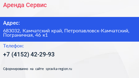 Аренда Сервис по адресу 683032, Камчатский край, Петропавловск-Камчатский, Пограничная, 46 к1 в дальнейшем Организация, размещена в следующих категориях: