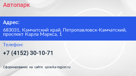 Автопарк по адресу 683031, Камчатский край, Петропавловск-Камчатский, проспект Карла Маркса, 1 в дальнейшем Организация, размещена в следующих категориях: