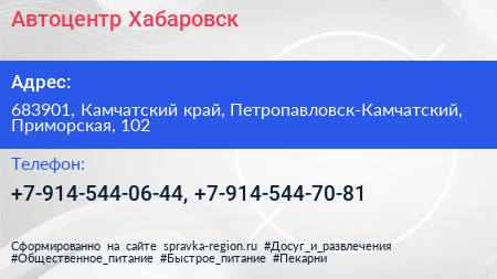 Автоцентр Хабаровск по адресу 683901, Камчатский край, Петропавловск-Камчатский, Приморская, 102 в дальнейшем Организация, размещена в следующих категориях: