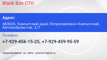 Black Box, СТО по адресу 683024, Камчатский край, Петропавловск-Камчатский, Автомобилистов, 1/7 в дальнейшем Организация, размещена в следующих категориях: