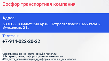 Босфор, транспортная компания по адресу 683006, Камчатский край, Петропавловск-Камчатский, Вулканная, 21а в дальнейшем Организация, размещена в следующих категориях: