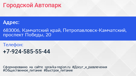 Городской Автопарк по адресу 683006, Камчатский край, Петропавловск-Камчатский, проспект Победы, 20 в дальнейшем Организация, размещена в следующих категориях: