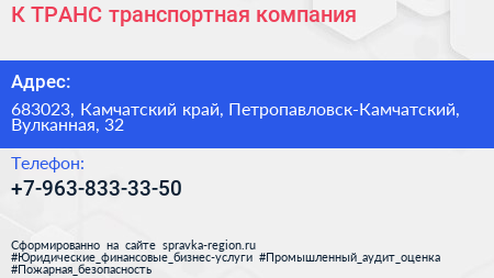 К-ТРАНС, транспортная компания по адресу 683023, Камчатский край, Петропавловск-Камчатский, Вулканная, 32 в дальнейшем Организация, размещена в следующих категориях: