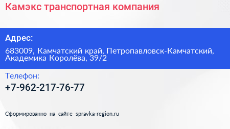 Камэкс, транспортная компания по адресу 683009, Камчатский край, Петропавловск-Камчатский, Академика Королёва, 39/2 в дальнейшем Организация, размещена в следующих категориях: