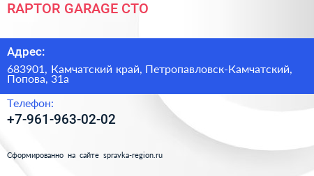 RAPTOR GARAGE, СТО по адресу 683901, Камчатский край, Петропавловск-Камчатский, Попова, 31а в дальнейшем Организация, размещена в следующих категориях:
