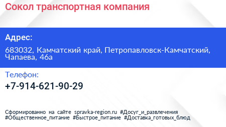 Сокол, транспортная компания по адресу 683032, Камчатский край, Петропавловск-Камчатский, Чапаева, 46а в дальнейшем Организация, размещена в следующих категориях: