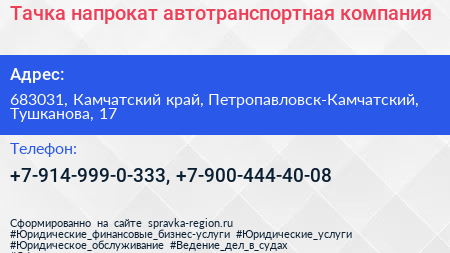 Тачка напрокат, автотранспортная компания по адресу 683031, Камчатский край, Петропавловск-Камчатский, Тушканова, 17 в дальнейшем Организация, размещена в следующих категориях: